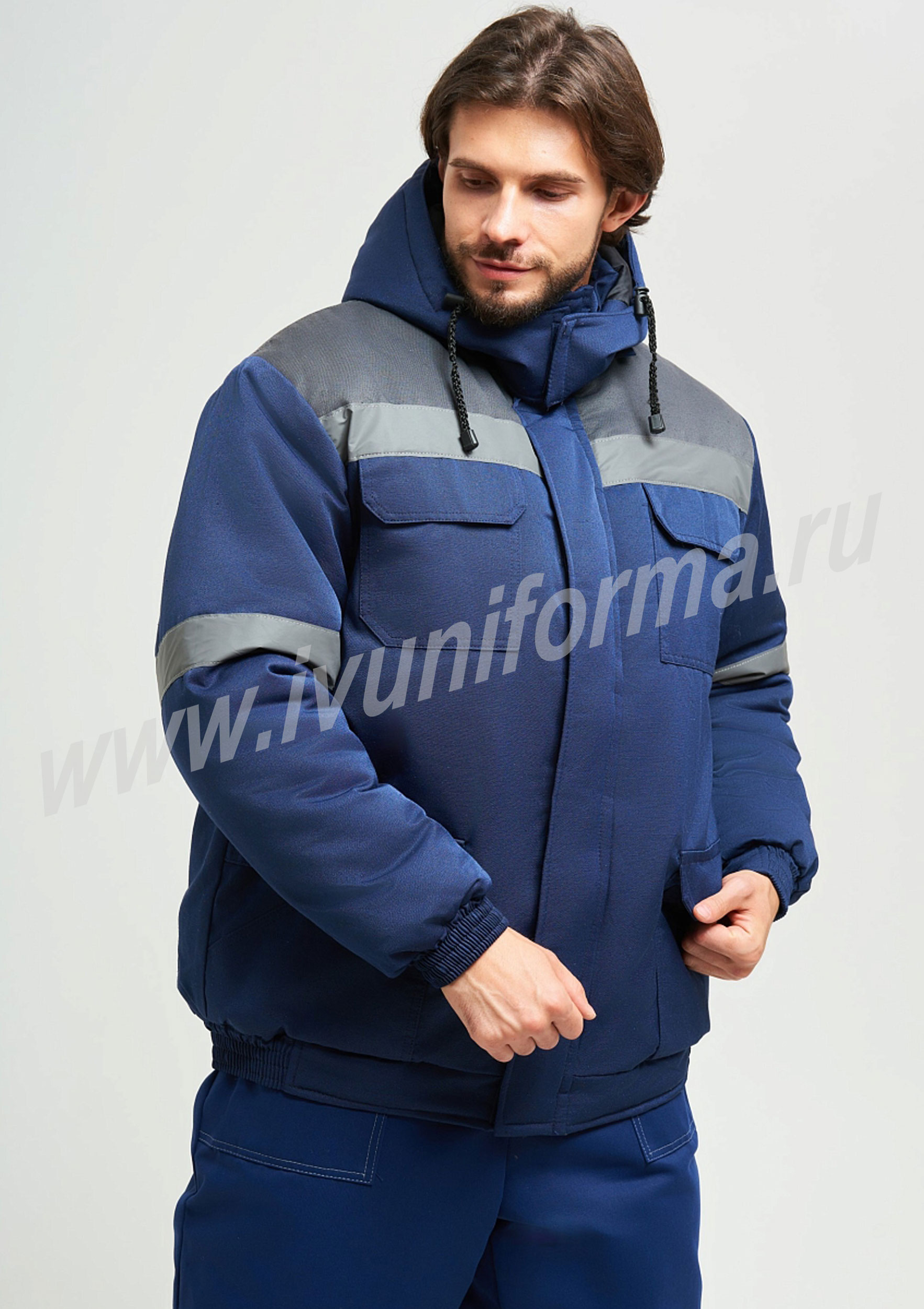 Куртка рабочая укороченная на поясе с центральной боровой застежкой на тесьму молнию, закрытую планкой на текстильной ленте велькро. Полочка состоит из двух частей, по линии стачивания которых настрочена светоотражающая лента шириной 50мм. На куртке два нагрудных накладных кармана с фигурным клапаном на текстильной ленте велькро. Два накладных боковых кармана с фигурным клапаном с соответствующей застежкой. Боковой карман имеет дополнительный карман. Наличие кармана внутри. Спинка состоит из двух частей, по линии стачивания которых настрочена светоотражающая лента шириной 50мм. На основной части спинки две складки. Рукав втачной одношовный. Низ рукава оформлен резинкой, внутри трикотажный манжет. Капюшон утепленный объемный с хомутом, пристегивается на молнию.